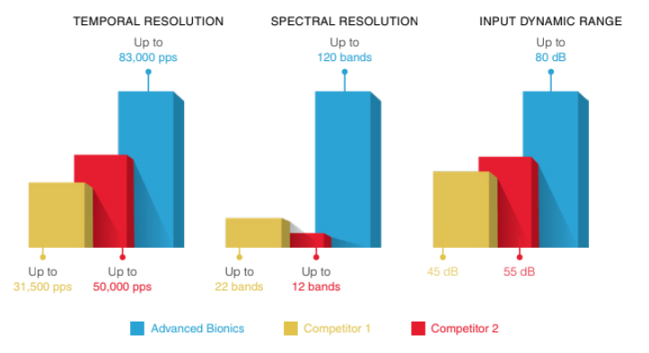 The HiResTM Ultra cochlear implant from Advanced Bionics (AB) consists of forward-thinking technologies that work together to provide the best CI based hearing possible. It is the capability and unsurpassed digital processing power that sets HiRes Ultra apart from other cochlear implants. HiResolution implantable technology is the foundation for optimal hearing. The quality of the sound delivered by a cochlear implant system is a direct result of how well the system captures and delivers the details of sound. The HiRes Ultra cochlear implant was designed to deliver all of the loudness, pitch, and timing information that is essential for natural sound perception and appreciation of music: it automatically encodes the widest range of intensities (up to 80 decibels); it is capable of delivering frequency information to 120 cochlear sites of stimulation using a patented delivery method called current steering; it provides up to 83,000 updates per second.